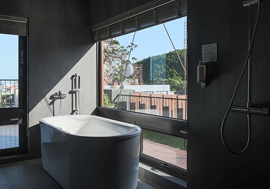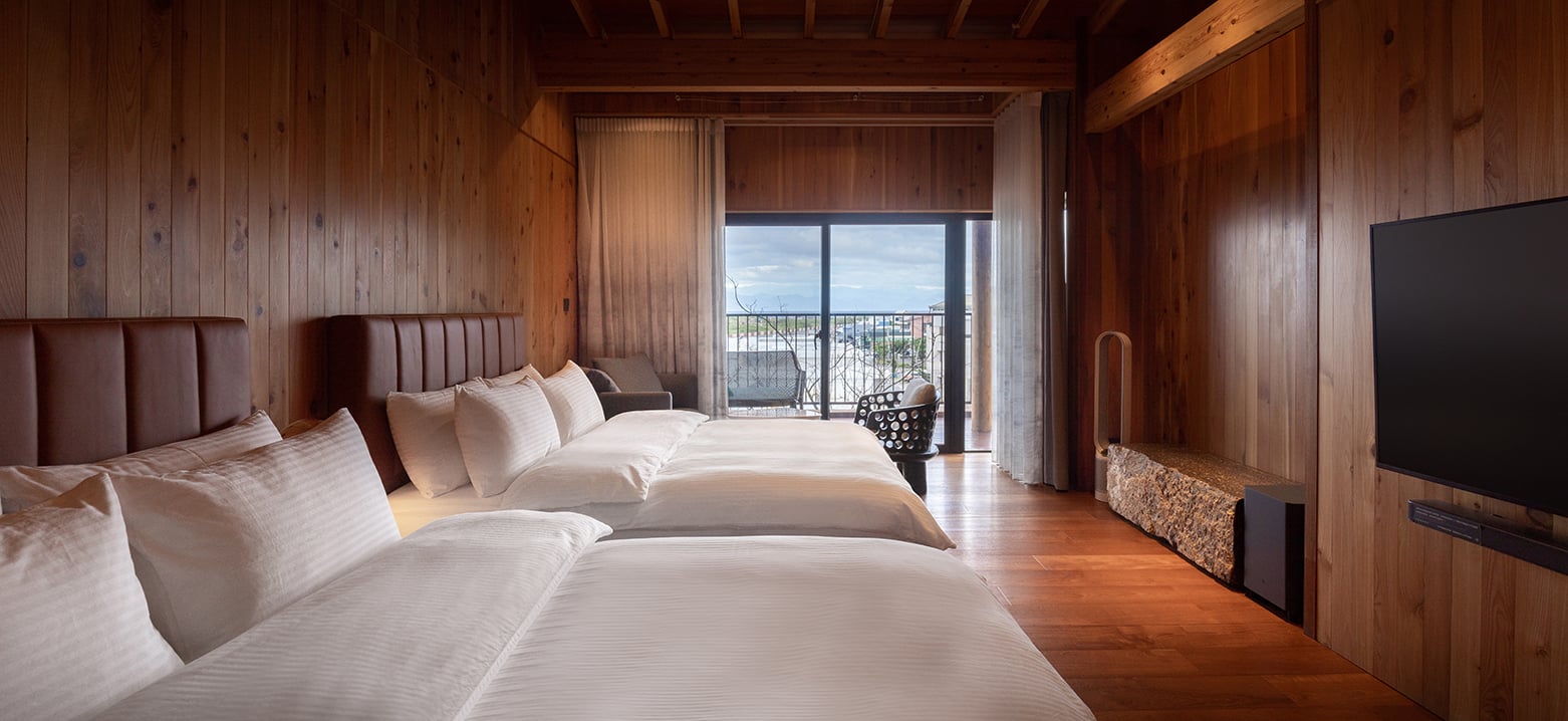 雙床位精緻客房,香杉木造空間典雅,磨石地板衛浴寬敞明亮,附設浴缸,沙發休憩區舒適寫意,品賞碧藍晴空海景風光。