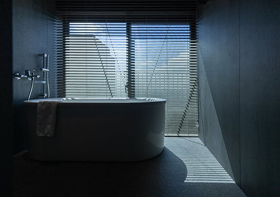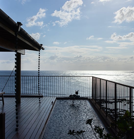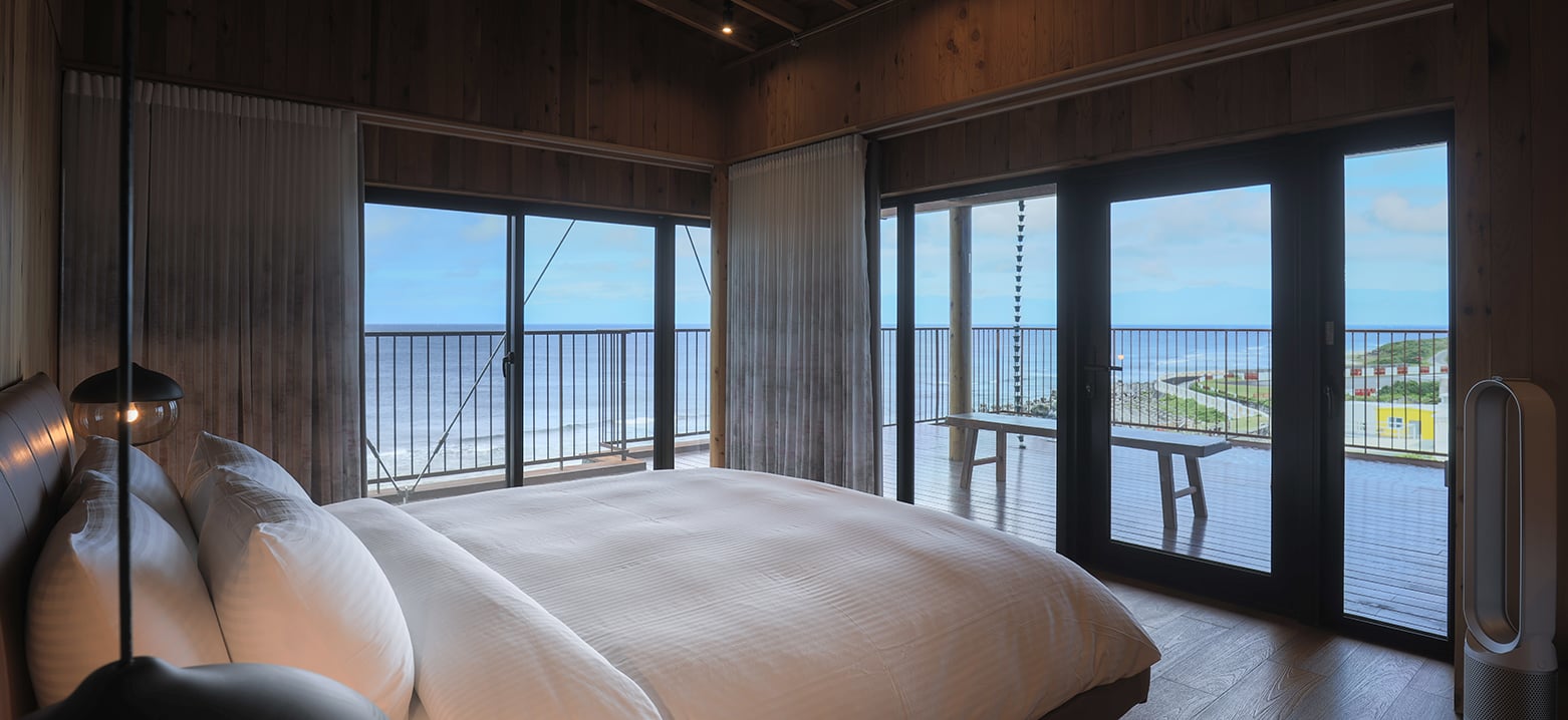 柔軟舒眠特大床,香杉木造空間典雅,衛浴採光明亮,附設浴缸,大面落地窗緊鄰造景露台,碧海藍天風光盡收眼底。